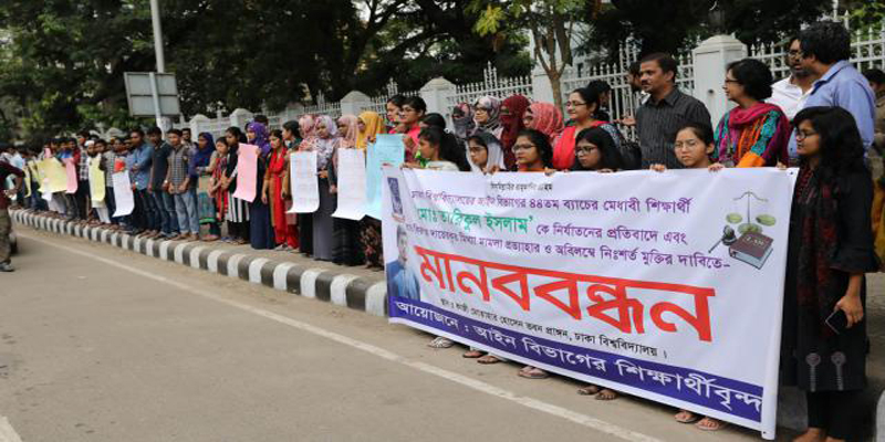 কোটা সংস্কার আন্দোলনের কর্মী ঢাকা বিশ্ববিদ্যালয়ের আইন অনুষদের শিক্ষার্থী মো. তারিকুল ইসলামের মুক্তির দাবিতে মানববন্ধন করেছেন অনুষদের শিক্ষক ও শিক্ষার্থীরা।...
