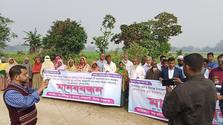দিনাজপুরের বীরগঞ্জ উপজেলার বড় করিমপুর দর্গাডাঙ্গা কবরস্থান রক্ষায় বড় করিমপুর ও জোতরঘু গ্রামের মানুষ একজোট হয়ে মানববন্ধন করেছে।