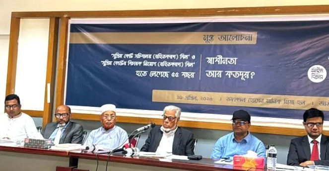 হিউম্যানিটি ফাউন্ডেশন এবং আইন ও বিচার পত্রিকার উদ্যোগে আয়োজিত এই আলোচনা সভায় আরও বক্তব্য রাখেন আপিল বিভাগের অবসরপ্রাপ্ত বিচারপতি আবদুল মতিন, জ্যেষ্ঠ আইনজীবী ব্যারিস্টার এহসান এ সিদ্দিক, ব্যারিস্টার ওমর ফারুক, আইনজীবী হাসান তারিক চৌধুরী, সাবেক যুগ্ম জজ ড. মো. সাজ্জাদ হোসেন এবং জুলাই আন্দোলনের নেতা আরিফ সোহেল প্রমুখ।