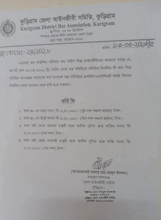 ২০২৬ সালে বার কাউন্সিল পরীক্ষায় উত্তীর্ণ আইনজীবীদের জন্য কুড়িগ্রাম জেলা আইনজীবী সমিতিতে সদস্যপদ গ্রহণের ভর্তি ফি বয়সভেদে আড়াই লাখ টাকা থেকে সর্বোচ্চ পাঁচ লাখ টাকা নির্ধারণ করা হয়েছে, যা নিয়ে আইন অঙ্গনে তীব্র আলোচনা ও অসন্তোষ সৃষ্টি হয়েছে।
