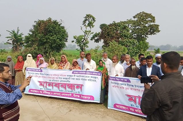 দিনাজপুরের বীরগঞ্জ উপজেলার বড় করিমপুর দর্গাডাঙ্গা কবরস্থান রক্ষায় বড় করিমপুর ও জোতরঘু গ্রামের মানুষ একজোট হয়ে মানববন্ধন করেছে। বুধবার (৩...