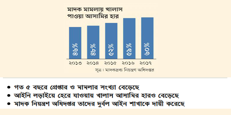 মাদকদ্রব্য নিয়ন্ত্রণ আইনে দায়ের হওয়া মামলায় গত বছর ৬০ শতাংশ আসামি ছাড়া পেয়েছেন। বিভিন্ন আদালতে এখনো বিচারের জন্য অপেক্ষাধীন মামলার...